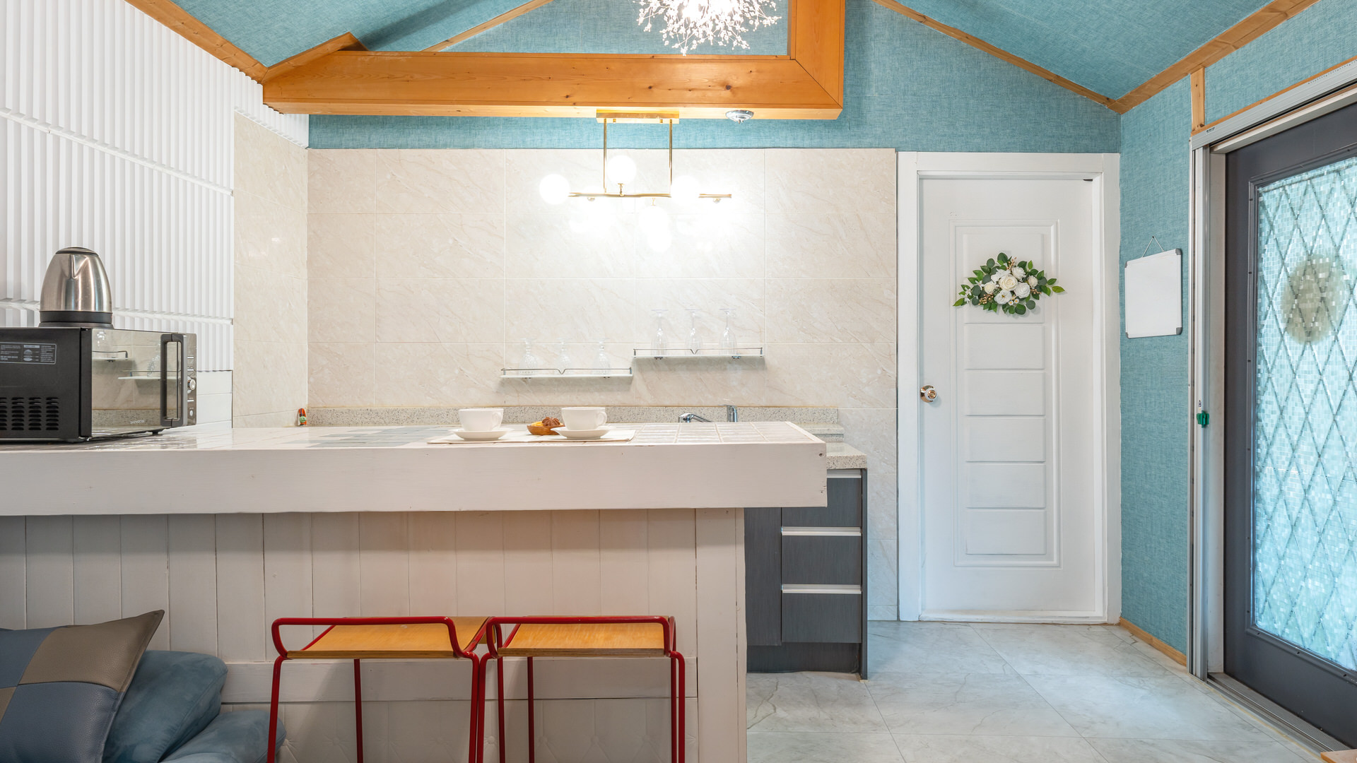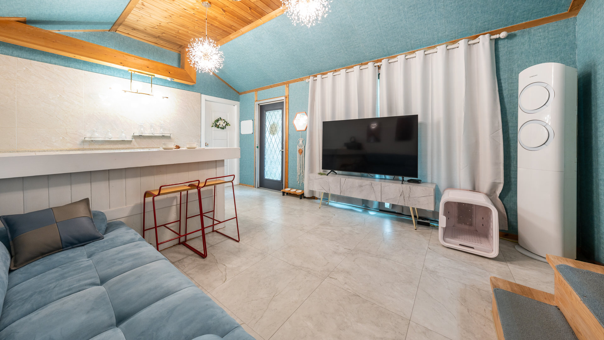 - 집기품목 : 욕실용품, 남녀공용, TV, 금연, 냉장고, 에어컨, 전기밥솥, 취사시설/도구, 샴푸, 린스, 바디워시, 와이파이, OTT, 애견 배변패드, 애견식기류, 전자레인지, 커피포트, 식탁