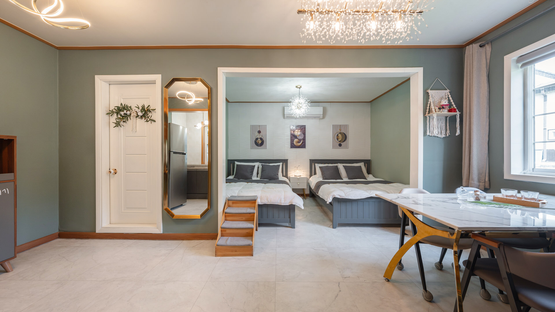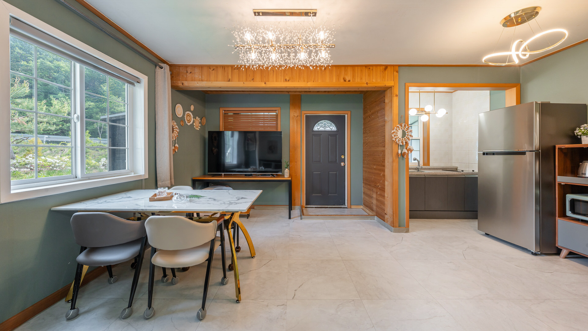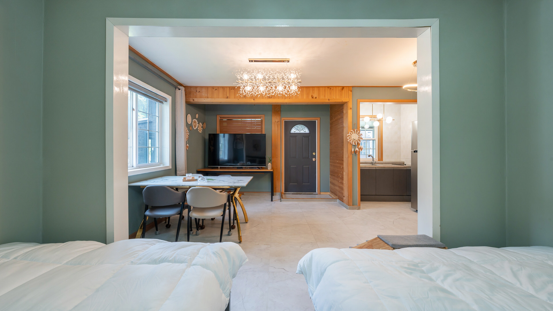 - 집기품목 : 욕실용품, 남녀공용, TV, 금연, 냉장고, 에어컨, 전기밥솥, 취사시설/도구, 샴푸, 린스, 바디워시, 와이파이, OTT, 애견 배변패드, 애견식기류, 전자레인지, 커피포트, 식탁